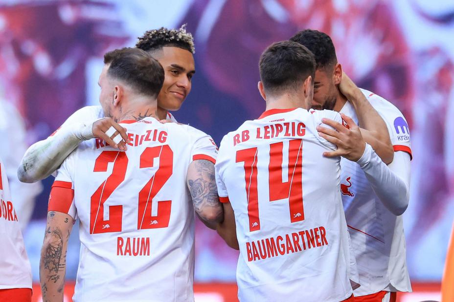 Antonio Nusa er blant gratulantene etter at Christoph Baumgartner scoret RB Leipzigs vinnermål mot Hamburg. Nusa la selv opp til Baumgartners første scoring. Foto: Jan Woitas, DPA via AP / NTB