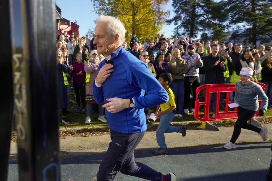 Statsminister Jonas Gahr Støre deltok i et løp under besøket på Manglerud skole i forbindelse med årets TV-aksjon. Foto: Terje Bendiksby / NTB