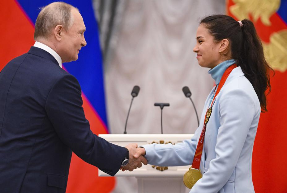 Den russiske langrennsløperen, her med landets president Vladimir Putin, reagerer kraftig på at FIS fortsatt sier nei til russiske utøveres deltakelse. Foto: Vladimir Astapkovitsj, Sputnik, Pool via AP / NTB