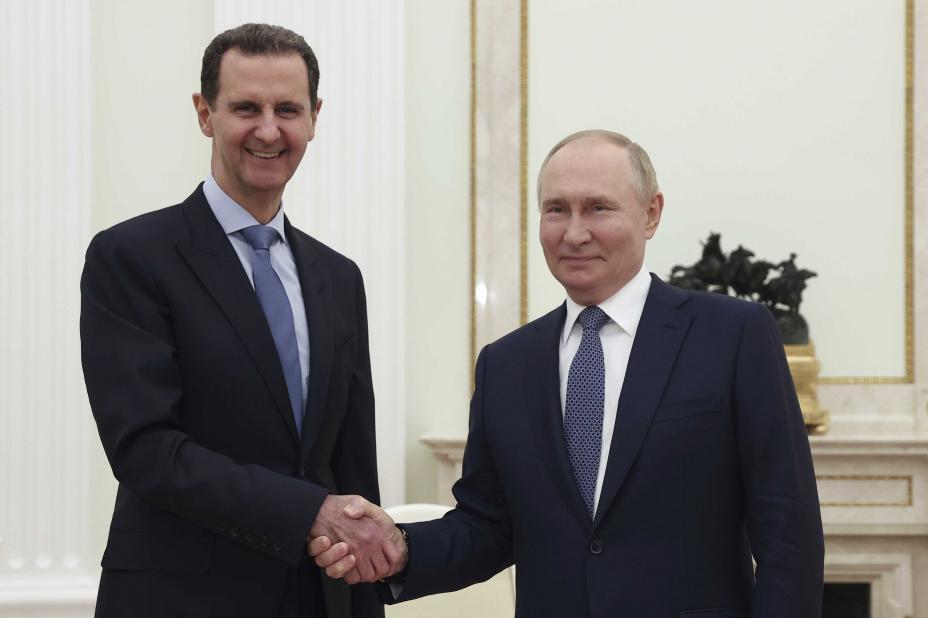 Bashar al-Assad (t.v.) håndhilser på Russlands president Vladimir Putin i Moskva sommeren 2024, rundt et halvt år før den syriske diktatoren måtte flykte til Moskva etter å ha blitt styrtet. Foto: Valerij Sjarifulin / Sputnik / Kreml Pool Photo / AP / NTB