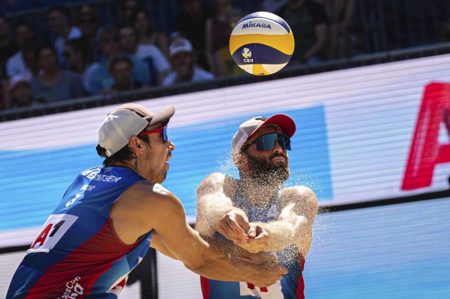 Mathias Berntsen og Hendrik Mol er klare for utslagsrundene i elite-16-turneringen i sandvolleyball i Cape Town. Foto: Florian Schroetter, AP / NTB