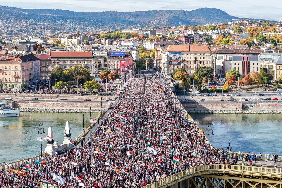 Titusenvis demonstrerte i Budapest torsdag, på dagen 69 år etter at den ungarske revolusjonen og uavhengighetskrigen mot Sovjetunionen brøt ut. Foto: Zsolt Czegledi / MTI via AP / NTB