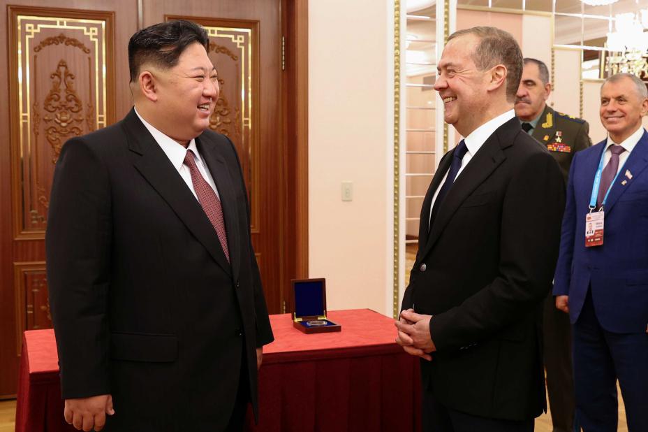 Stemningen var god da Nord-Koreas leder Kim Jong-un og Russlands tidligere president Dmitrij Medvedev møttes i Pyongyang i Nord-Korea for to uker siden. Foto: Ekaterina Sjtukina / Sputnik / AP / NTB