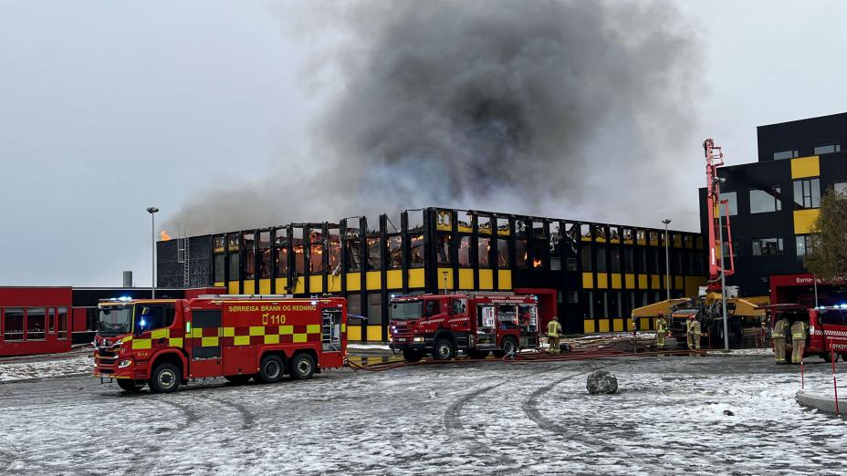 Ulykker og naturkatastrofer: Sørreisa kommune har satt krisestab etter at en omfattende brann søndag morgen rammet den nye skolen i kommunen. Først ved 12-tiden hadde brannvesenet kontroll over flammene.