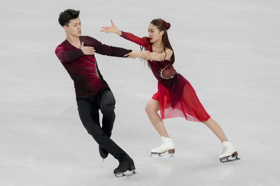 Ren Junfei and Xing Jianing avbilde i et ISU-mesterskap i kunstløp tidligere i år. Foto: Lee Jin-man / AP / NTB