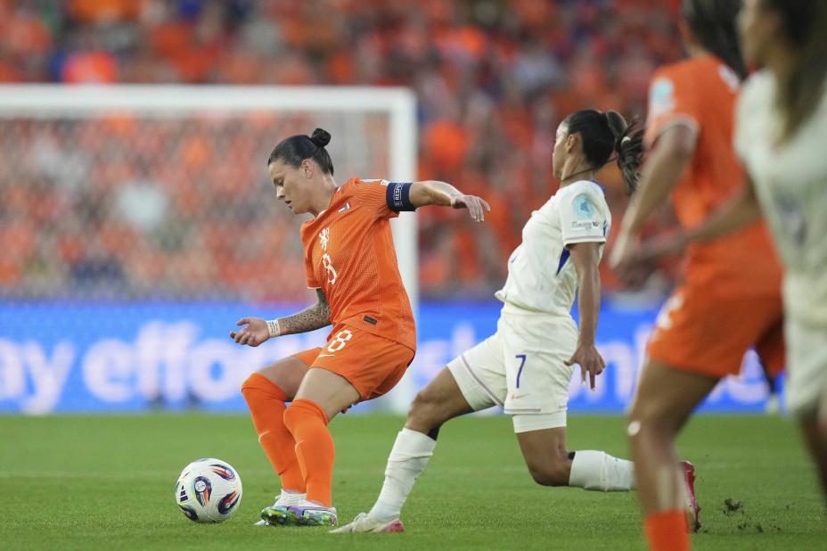 Sherida Spitse (til v.) i aksjon for Nederland mot Frankrike i sommerens EM-sluttspill. Foto: Alessandra Tarantino, AP / NTB