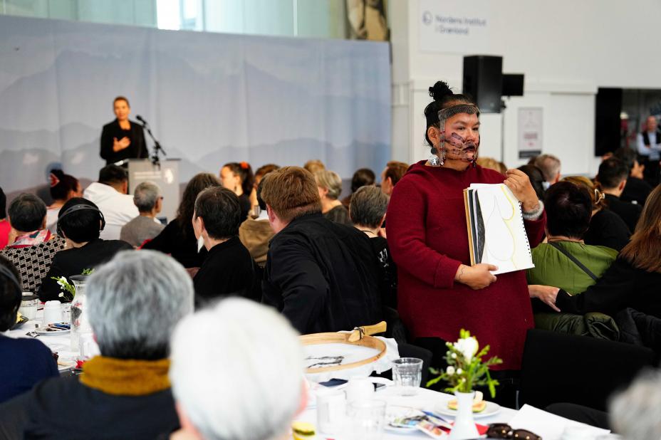 En grønlandsk kvinne vender ryggen til Danmarks statsminister Mette Frederiksen da sistnevnte ga en offentlig unnskyldning for spiralinngrepene. Foto: Mads Claus Rasmussen / Ritzau Scanpix / AP / NTB