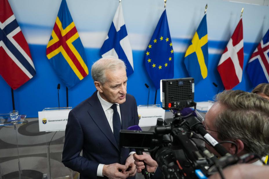 Statsminister Jonas Gahr Støre (Ap) intervjues under det nordiske statsministermøtet i Stockholm tirsdag.
