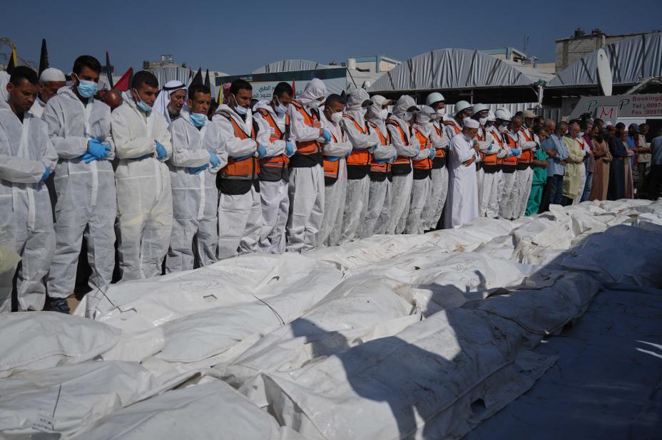 Et medisinsk team ber en bønn over drepte palestinere som ikke er identifisert. De ble returnert fra Israel som ledd i våpenhvileavtalen med Hamas og lagt i en massegrav utenfor Nasser-sykehuset i Khan Younis på Gazastripen. Foto: Jehad Alshrafi / AP / NTB