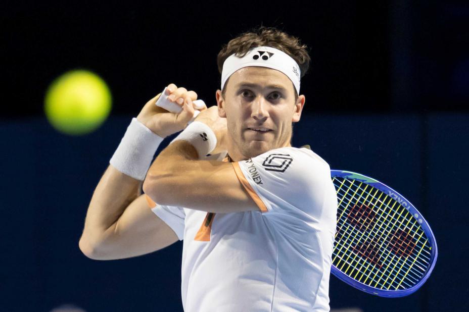 Casper Ruud i aksjon i Basel i Sveits sist uke. Han måtte til slutt trekke seg fra kvartfinalen mot Alejandro Davidovich Fokina. Foto: Georgios Kefalas / Keystone via AP / NTB