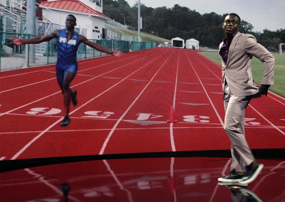 Issam Asinga fotografert i forbindelse med en prisutdeling for highschool-utøvere i USA. Sprinterens anke mot en fireårig dopingutelukkelse er avvist av Idrettens voldgiftsrett. Foto: Damian Dovarganes, AP / NTB