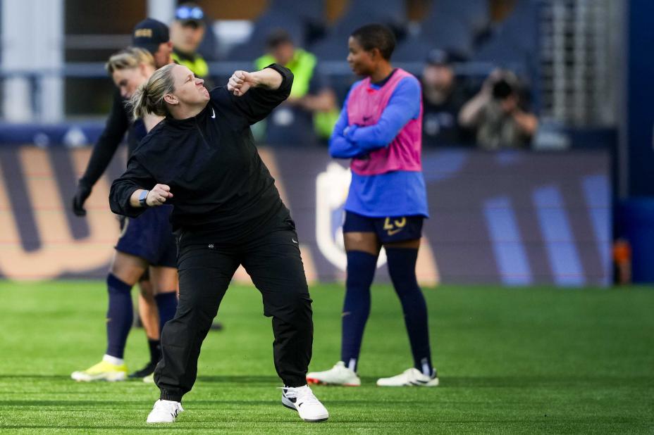 Fotballtrener Laura Harvey snakker om KI-bruk i en podkast. Her jubler hun etter seier mot Washington Spirit i fjor. Foto: Lindsey Wasson / AP / NTB