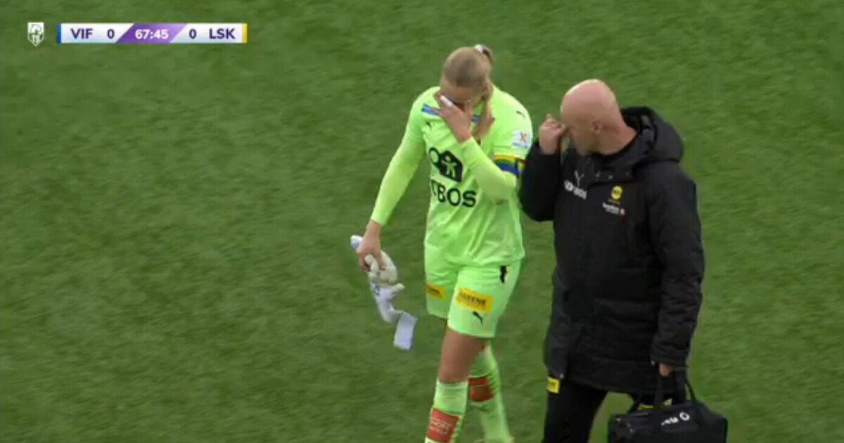 27-åringen kjempet mot tårene da hun forlot banen med smerter i skulderen. Inn kom reservekeeper Emma Sjåfjell.