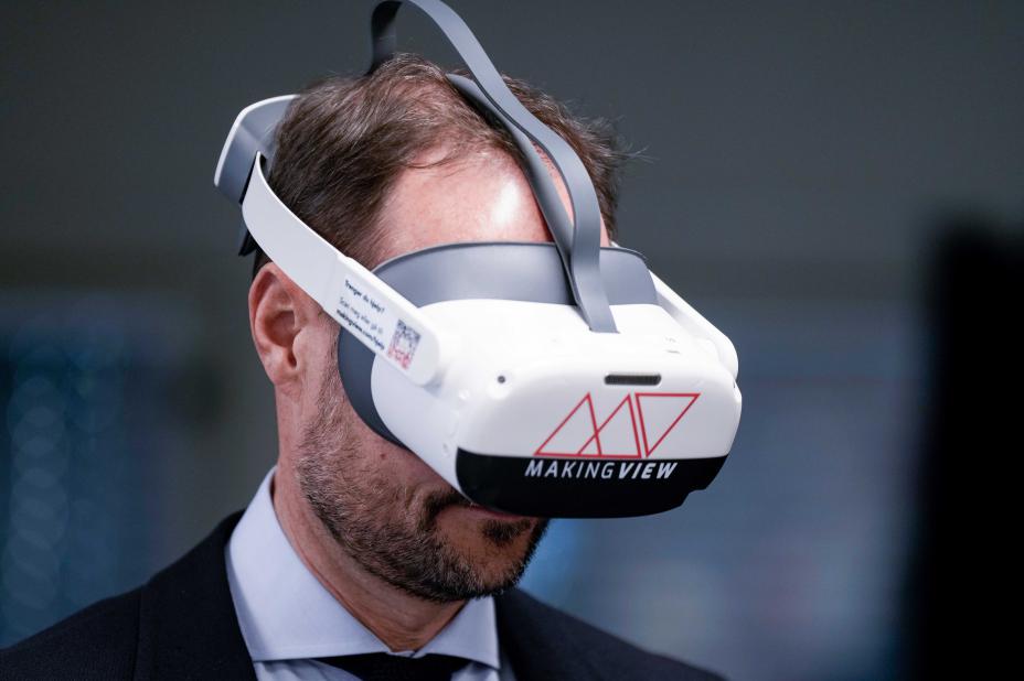 Kronprins Haakon møtte elever ved Eidsvoll videregående skole og deltok i et undervisningsopplegg om KI og kildekritikk. Foto: Cornelius Poppe / NTB