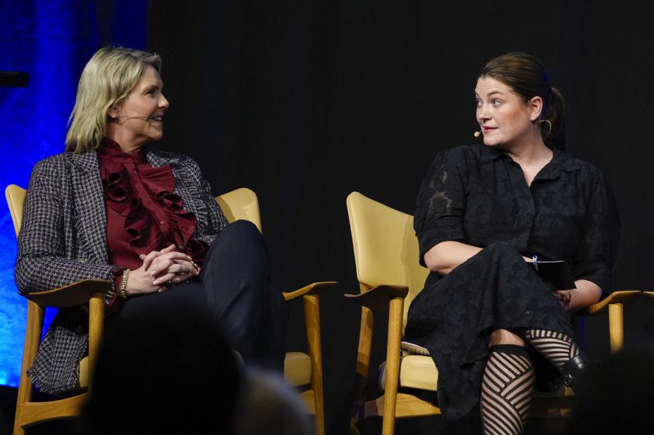Frp-leder Sylvi Listhaug (t.v.) og næringsminister Cecilie Myrseth (Ap) i debatt på Yaras høstkonferanse. Foto: Lise Åserud / NTB