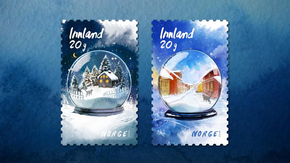 Årets frimerker viser snøkuler med motiv fra Klokkarstua i Hurum og Kampen i Oslo. Foto: Posten Norge / Handout / NTB