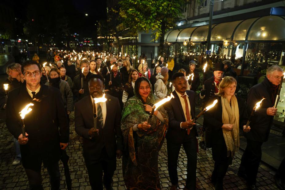 Hundrevis av bergensere hyllet Raftopris-vinnerne fra Sudan søndag kveld. I fremste rekke gikk Coman Nooralden, Alaa Hassan og Saddam Idris Abdurhman, som mottok prisen på vegne av den sudanske organisasjon Emergency Response Rooms (ERR).