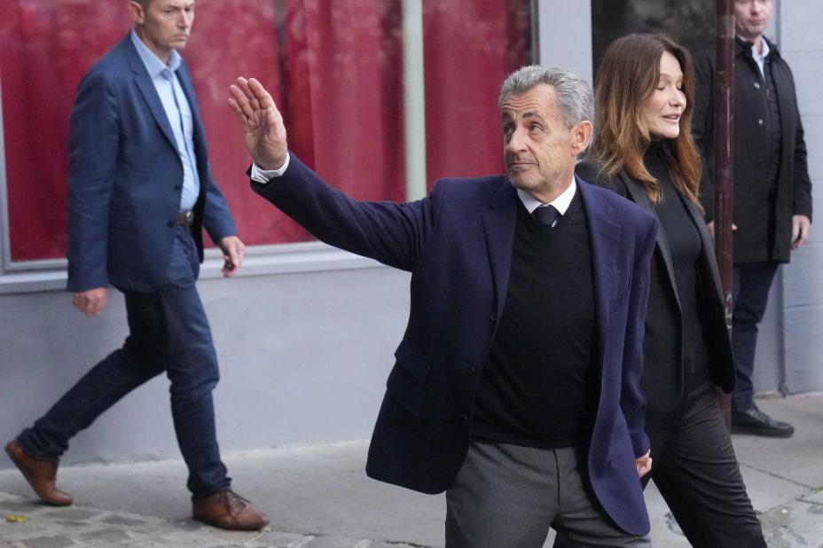 Frankrikes tidligere president Nicolas Sarkozy og hans kone Carla Bruni-Sarkozy da de forlot sitt hjem 21. oktober, dagen da Sarkozy ble fengslet i en sak om hemmelig valgkampstøtte fra Libya i 2007. Foto: Thibault Camus / AP / NTB
