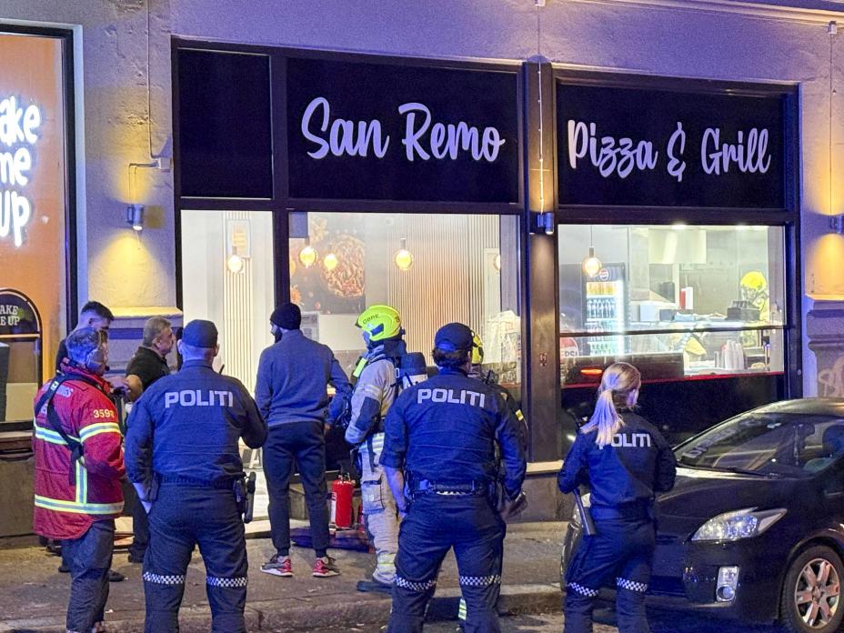 Nødetatene er ved pizza- og grillrestauranten San Remo på Torshov i Oslo mandag i forbindelse med en brann. Foto: Rodrigo Freitas / NTB