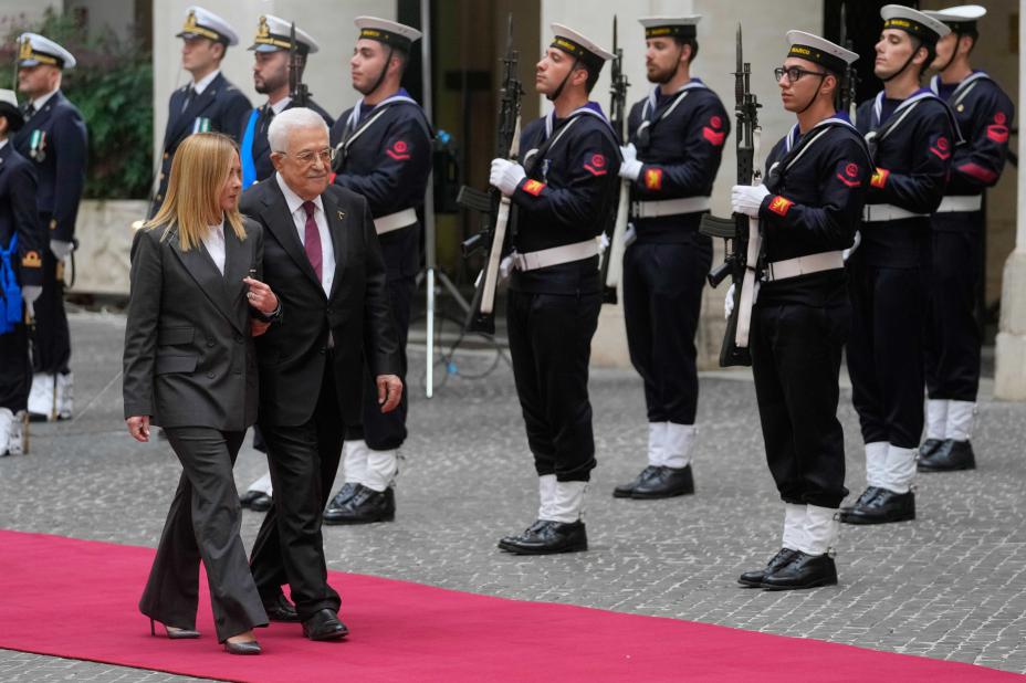 Palestinas president Mahmoud Abbas sammen med Italias statsminister Giorgia Meloni i Roma fredag. Tirsdag er Abbas i Paris. Foto: Gregorio Borgia / AP / NTB