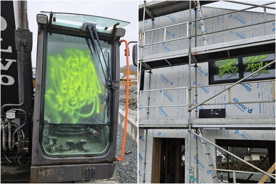 På byggeplassen ble både to gravemaskiner, en dumper og vinduene på et av rekkehusene sprayet med grønn maling.