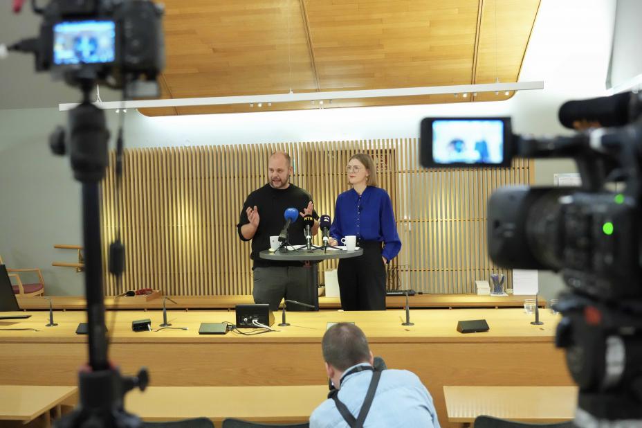 Partiet Rødt la fram sitt alternative statsbudsjett 2026 onsdag formiddag. Leder Marie Sneve Martinussen og finanspolitisk talsperson Mimir Kristjansson under presentasjonen.