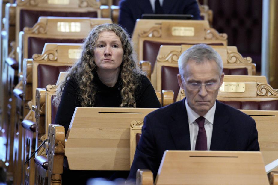 Arbeiderpartiets Tuva Moflag, her med finansminister Jens Stoltenberg (Ap), skal lede forhandlingene om statsbudsjettet med de andre tuttifrutti-partiene. Foto: Stian Lysberg Solum / NTB