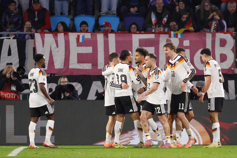 Nick Woltemade feirer mål for Tyskland med lagkameratene. Foto: Geert Vanden Wijngaert / AP / NTB