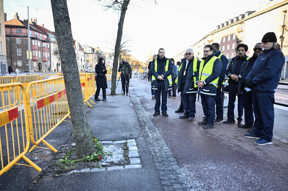 Bussjåfører besøker ulykkesplassen for å hedre ofrene etter fredagens ulykke. Tre personer omkom og flere andre ble skadet da bussen traff et busskur. Foto: Christine Olsson / TT / NTB