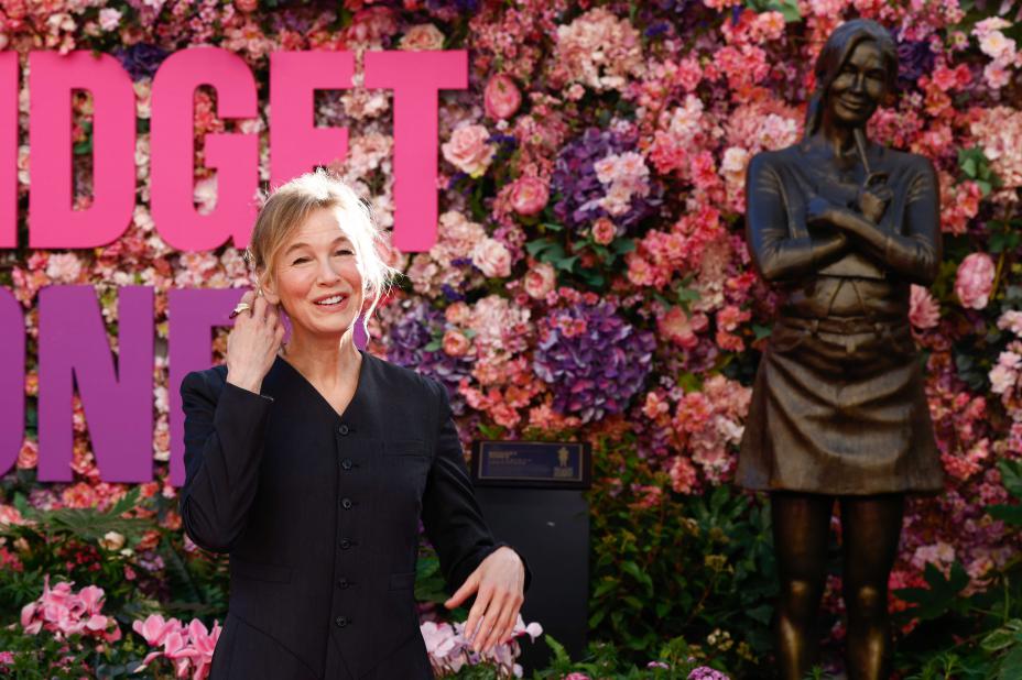 Renée Zellweger poserer foran Bridget Jones-statuen som ble avduket mandag på Leicester Square i London. Foto: Millie Turner/ Invision/ AP/ NTB