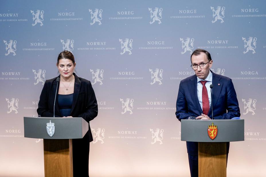 Utenriksminister Espen Barth Eide og næringsminister Cecilie Myrseth holder pressetreff i Utenriksdepartementet om EUs avgjørelse om innføring av toll på jernlegeringer. Foto: Jonas Fæste Laksekjøn / NTB