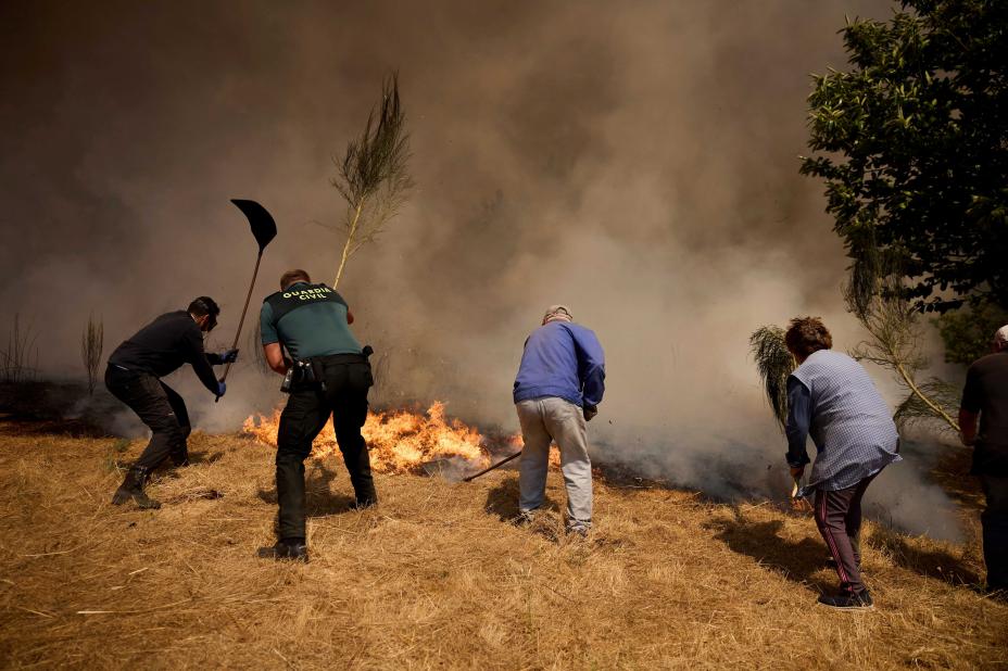 Innbyggere kjemper mot en skogbrann på vei mot landsbyen Rebordondo i Ourense i Spania i august. Arkivfoto: Pablo Garcia / AP / NTB