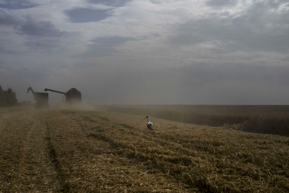 Arealet for korndyrking er blitt kraftig redusert etter at Russland invaderte Ukraina i 2022. Her fra innhøsting i den østlige Tsjerkasy-regionen i 2022. Arkivfoto: Jae C. Hong/ AP/ NTB