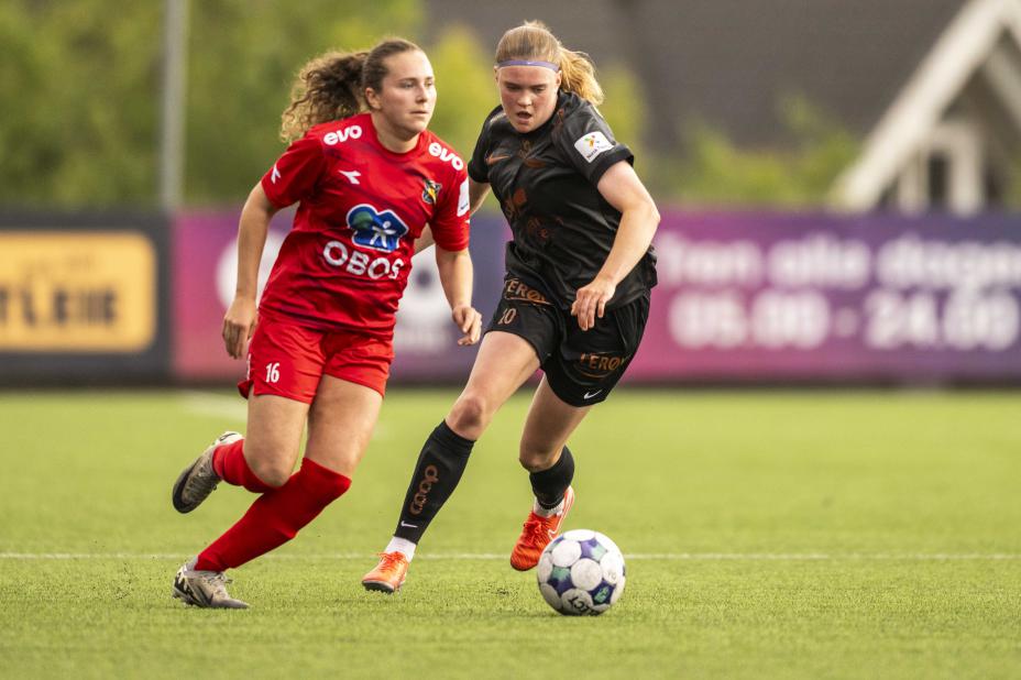 Sofia Krossøy (til v.) scoret Røas mål mot Åsane. Her er hun i duell med Signe Gaupset i en kamp mot Brann. Foto: Annika Byrde / NTB
