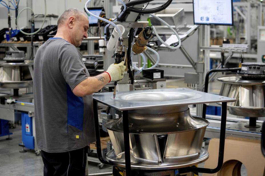 En mann jobber med en vifte på EBM-Papsts fabrikk i tyske Hollenbach. Den tyske økonomien mistet 50.800 jobber til utlandet i perioden 2021-2023, ifølge landets myndigheter. Foto: Michael Probst / AP / NTB