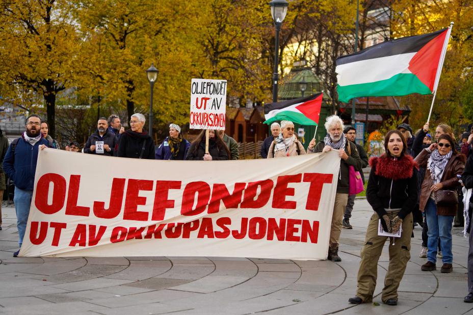 Aksjonsgruppen for Palestina aksjonerte utenfor Stortinget, under stortingsmøtet om nytt etisk rammeverk for oljefondet. Foto: Ole Berg-Rusten / NTB
