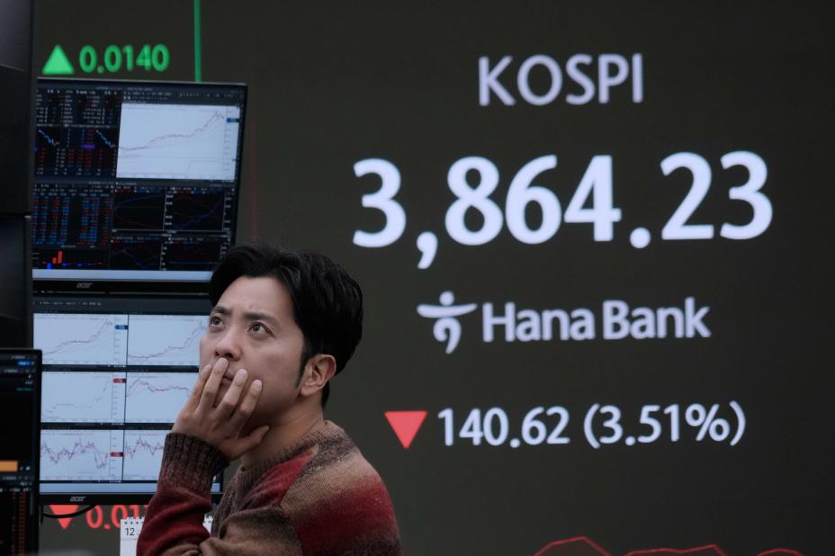 Asiatiske børser tok helg med bred nedgang, og europeiske børser ser ut til å følge samme sporet, dog ikke med like bratte fall. Foto: Ahn Young-joon / AP / NTB