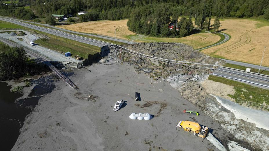 Dronebilde over raset ved Nesvatnet utenfor Levanger. Nå foreslår regjeringen en midlertidig kompensasjonsordning for godsoperatører som er rammet av dette raset og raset på Raumabanen. Foto: Jan Langhaug / NTB