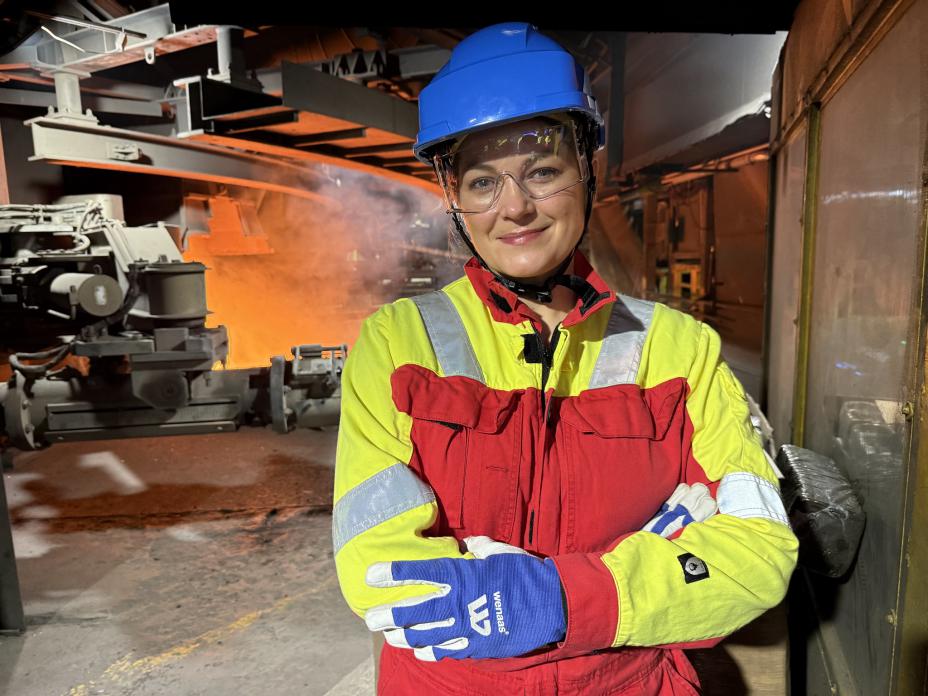 Næringsminister Cecilie Myrseth (Ap) i fullt verneutstyr inne på Eramets anlegg i Sauda lørdag. Foto: NFD / Handout / NTB