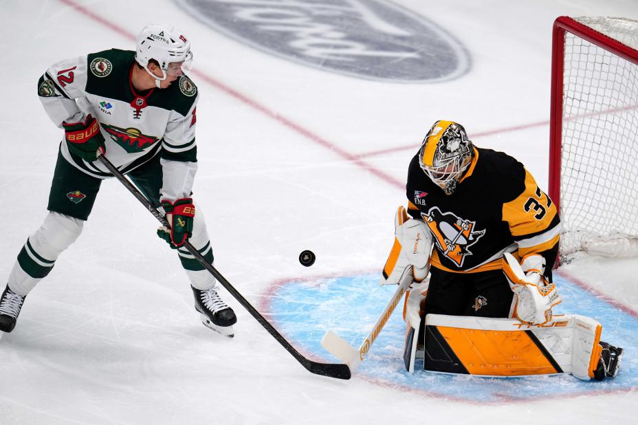 Matt Boldy (til venstre) sørget for to av målene da Minnesota tok en soleklar seier i Pittsburgh fredag. Foto: Gene J. Puskar / AP / NTB