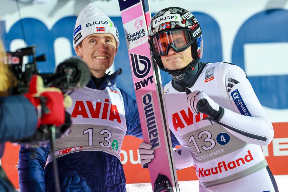 Kristoffer Eriksen Sundal (t.v.) og Marius Lindvik er blant de norske hopperne som håper på bedre plasseringer i Falun.