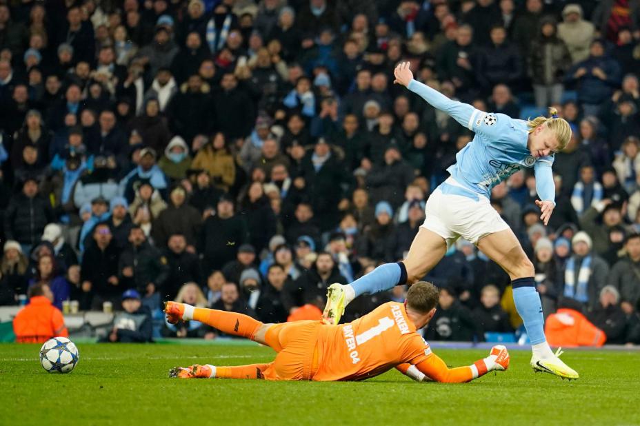 Erling Braut Haaland i aksjon mot Leverkusen tirsdag. Foto: Dave Thompson / AP / NTB