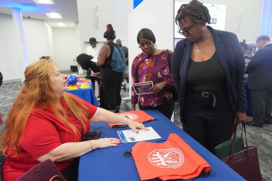 Disse to kvinnene er blant flere jobbsøkere som besøkte yrkesmesse i Miami i oktober. Foto: Marta Lavandier / AP / NTB