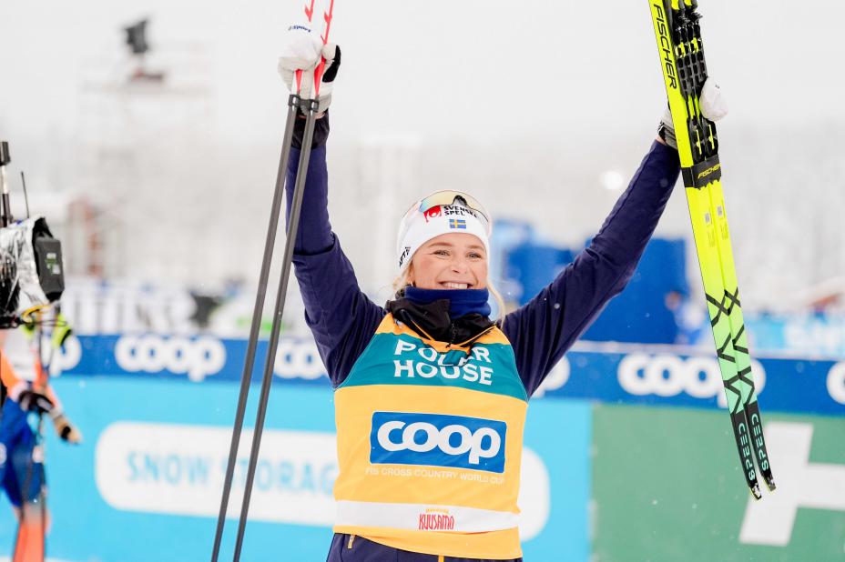 Frida Karlsson jubler etter seieren i Ruka fredag. Foto: Terje Pedersen / NTB
