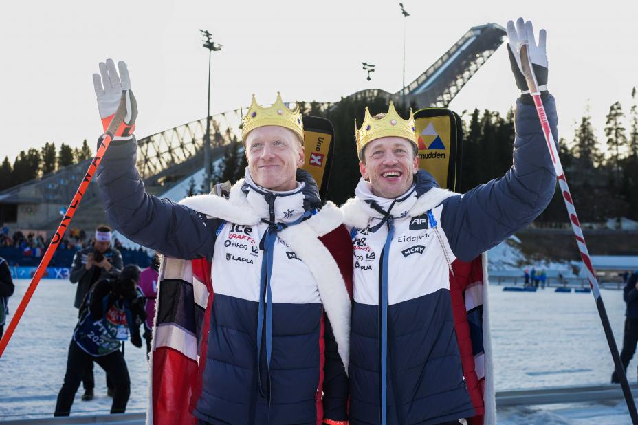 Tarjei Bø og Johannes Thingnes Bø ble feiret etter at de satte punktum for store karrierer i Holmenkollen i mars. I februar skal de være NRKs skiskyttereksperter under OL. Foto: Terje Pedersen / NTB