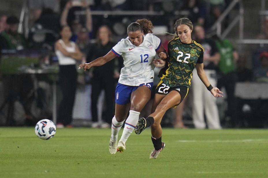Michelle Cooper fra USA og Solai Washington fra Jamaica i en landskamp i år. Mye tyder på at de to landene skal arrangere VM sammen med Mexico og Costa Rica i 2031. Foto: Jeff Roberson, AP / NTB