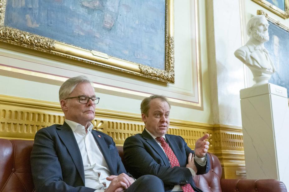 Frps nestleder Hans Andreas Limi og første nestleder i Stortingets kommunal- og forvaltningskomité, Erlend Wiborg, vil gi 5,8 milliarder kroner til kommunene. Foto: Jonas Fæste Laksekjøn / NTB