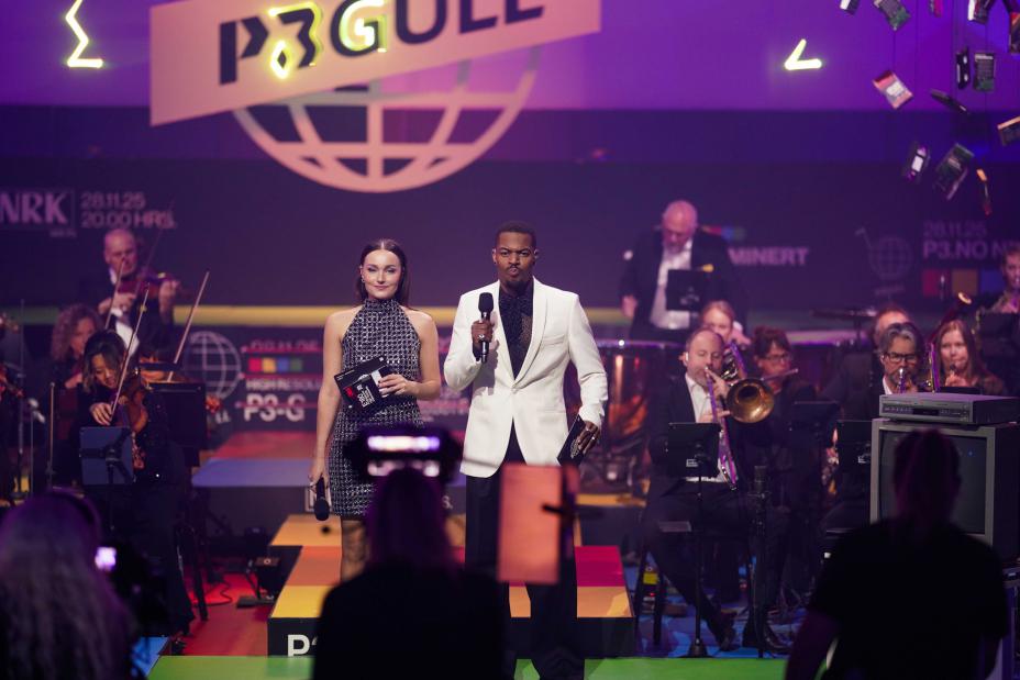 Programleder Arian Engebø og Nate Kahungu under P3Gull-direktesendingen fra Store studio fredag kveld.