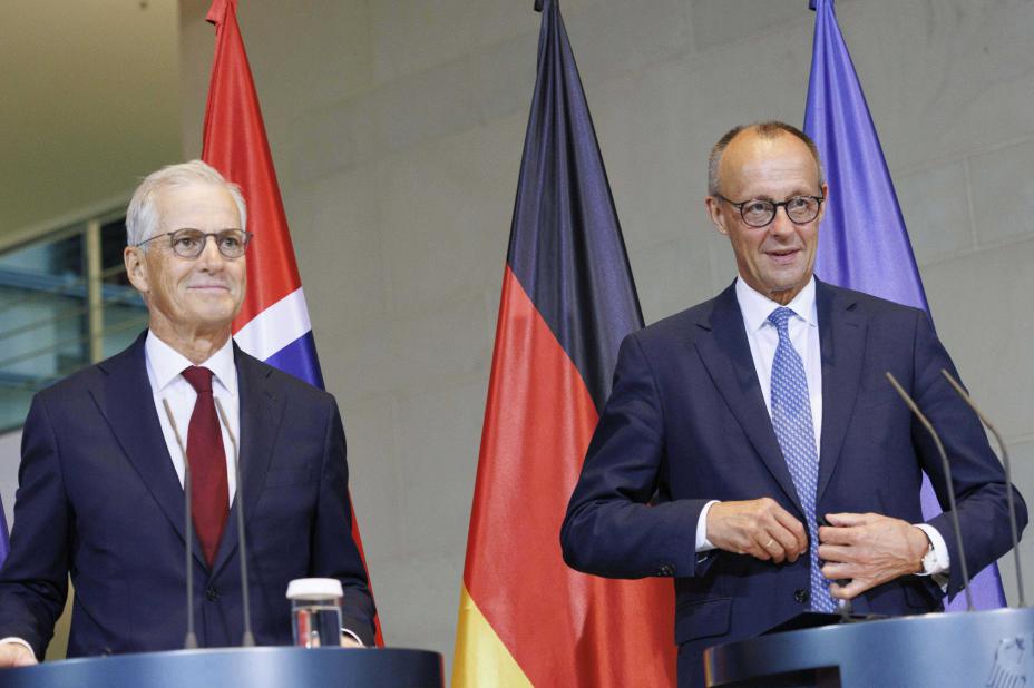 Statsminister Jonas Gahr Støre (t.v.) og forbundskansler Friedrich Merz da Støre var i Berlin i juli i år. Foto: Carsten Koall / DPA / AP / NTB