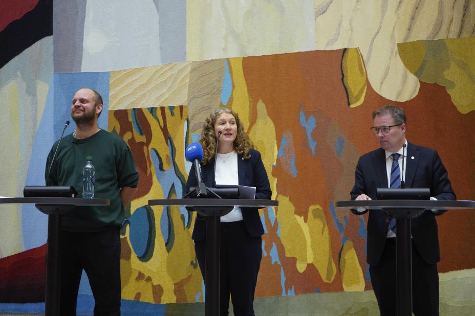 Mimir Kristjansson (Rødt), Tuva Moflag (Ap) og Bjørn Arild Gram (Sp) under en pressekonferanse på Stortinget lørdag i forbindelse med ferdigstillelse av statsbudsjettet for 2026. Foto: Thomas Fure / NTB